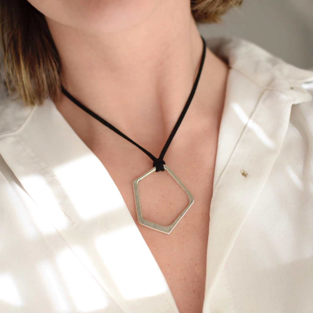 Collar con cordón de gamuza y dije de 4x4 cm aproximadamente.
